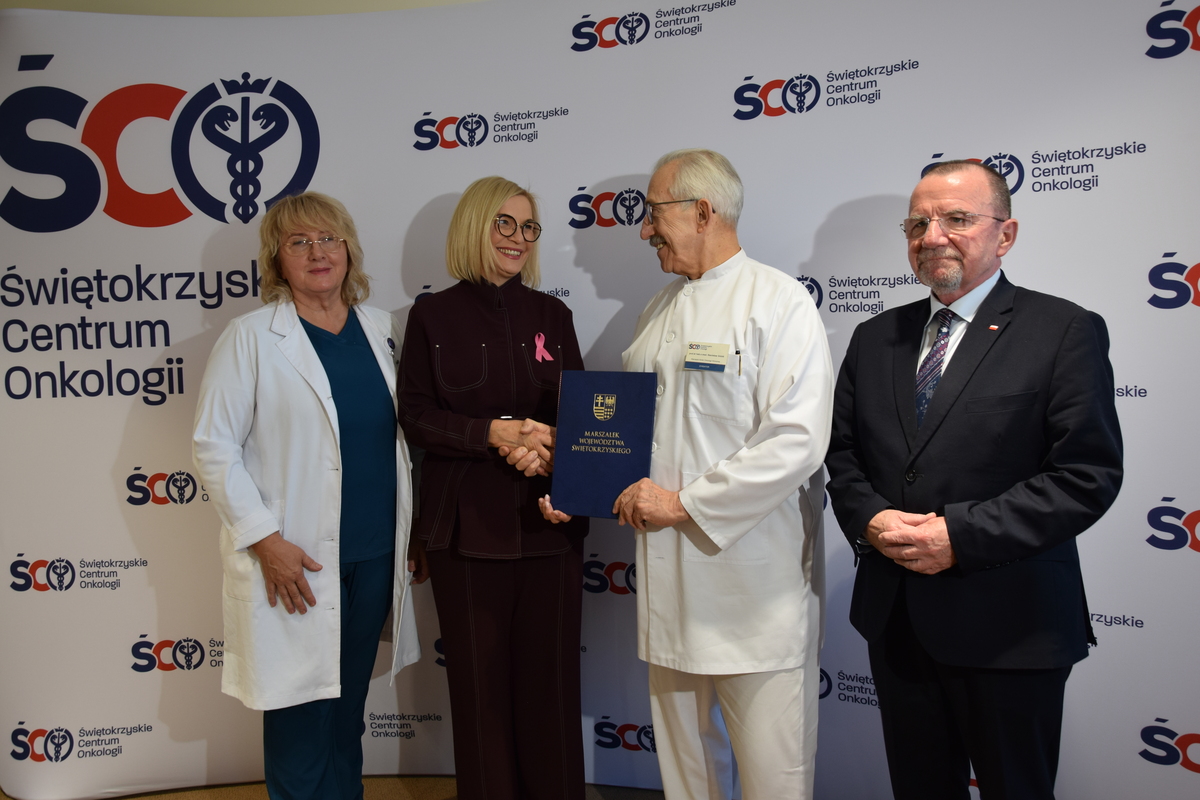 Od lewej: wicemarszałek województwa świętokrzyskiego Marek Bogusławski; marszałek województwa świętokrzyskiego Renata Janik; prof. dr hab. n. med. Stanisław Góźdź, dyrektor Świętokrzyskiego Centrum Onkologii; dr hab. n. med. Jolanta Smok - Kalwat, zastępca dyrektora ds. klinicznych