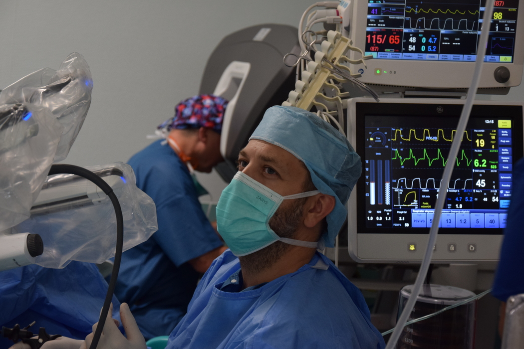 - Ponieważ chory był wcześniej leczony onkologicznie, a my poczuwamy się do ciągłości opieki nad naszymi pacjentami, szukaliśmy rozwiązania tej sytuacji. Po przeanalizowaniu zaproponowaliśmy pacjentowi operację będącą połączeniem dwóch zaawansowanych technik chirurgicznych. Uznaliśmy, że przy ich jednoczasowym połączeniu chory zostanie skutecznie zoperowany z powodu dwóch współistnienie problemów: zwężenia zespolenia skutkującego kłopotami z wypróżnianiem oraz polipa czyli nowotworu łagodnego – tłumaczy chirurg. - Dostęp do tej okolicy był trudny, dlatego od strony brzucha zastosowaliśmy chirurgię robotyczną, która daje nam największą precyzję i powiększenie pola operacyjnego a od strony odbytu wykonaliśmy zabieg endoskopowy w celu nawigowania. Przy pomocy robota wycięliśmy cały chory odcinek jelita, w którym znajdował się polip i zwężenie. Połączenie dwóch technik umożliwiło nam zoperowanie tego pacjenta w skuteczny i mało inwazyjny sposób – wyjaśnia dr Paweł Renkielski.