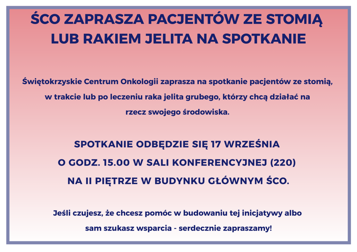 Serdecznie zapraszamy na spotkanie pacjentów zmagających się z rakiem jelita grubego oraz osób ze stomią, które odbędzie się 17 września 2025 roku o godzinie 15:00 w Świętokrzyskim Centrum Onkologii (sala konferencyjna 220, budynek główny, II piętro).