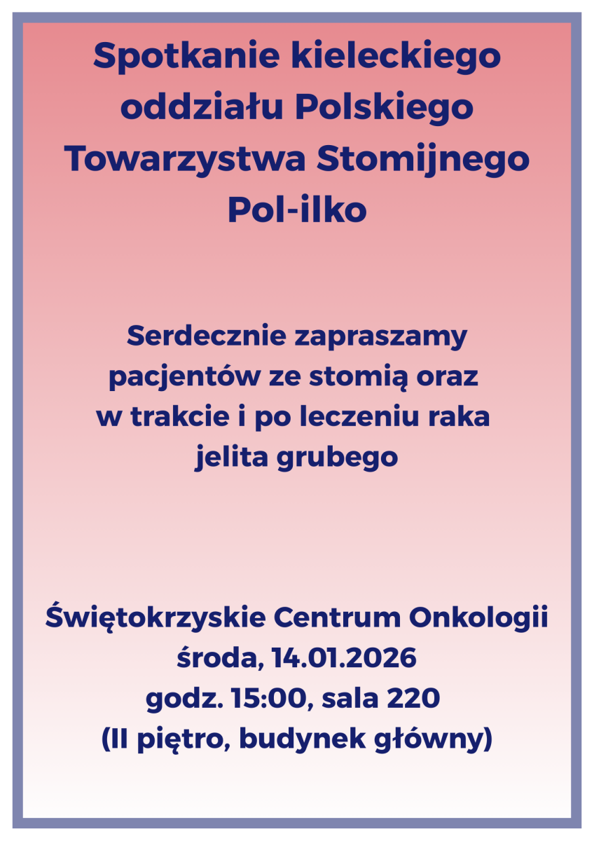 Serdecznie zapraszamy pacjentów ze stomią oraz w trakcie i po leczeniu raka jelita grubego na spotkanie kieleckiego oddziału Polskiego Towarzystwa Stomijnego Pol-ilko.