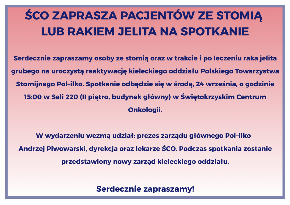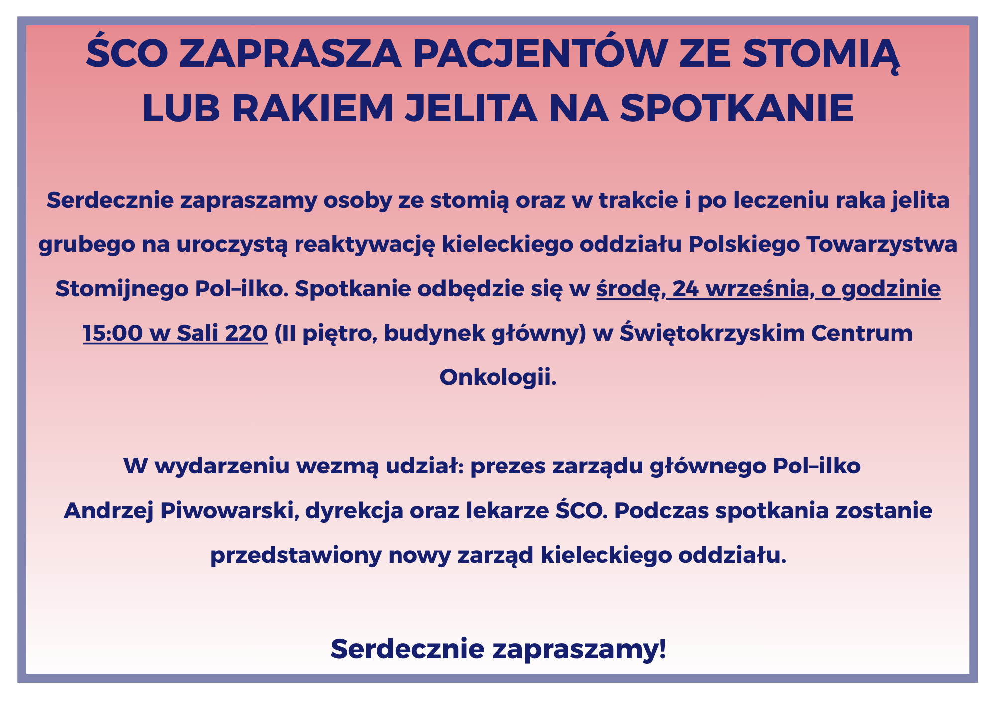 Serdecznie zapraszamy osoby ze stomią oraz w trakcie i po leczeniu raka jelita grubego na uroczystą reaktywację kieleckiego oddziału Polskiego Towarzystwa Stomijnego Pol-ilko. Spotkanie odbędzie się w środę, 24 września, o godzinie 15:00 w Sali 220 (II piętro, budynek główny) w Świętokrzyskim Centrum Onkologii.