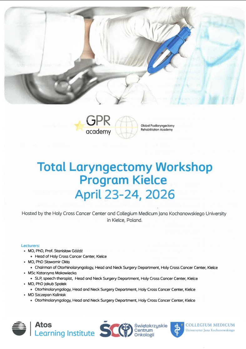 Międzynarodowe Warsztaty Otolaryngologiczne „Total Laryngectomy Workshop” pod patronatem Global Postlaryngectomy Rehabilitation Academy (GPR Academy), 23-24.04. 2026 r., Świętokrzyskie Centrum Onkologii w Kielcach. Organizatorem wydarzenia jest Klinika Otolaryngologii, Chirurgii Głowy i Szyi Świętokrzyskiego Centrum Onkologii.