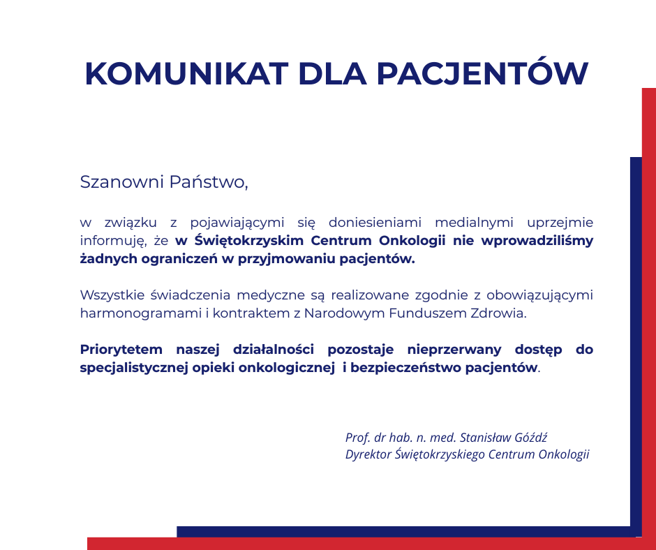 Misją Świętokrzyskiego Centrum Onkologii jest KOMPLEKSOWE LECZENIE i BEZPIECZEŃSTWO CHOREGO Zatwierdził: Prof. dr hab. n. med. Stanisław Góźdź Załącznik: Misja Świętokrzyskiego Centrum Onkologii - do wydrukuCentrum